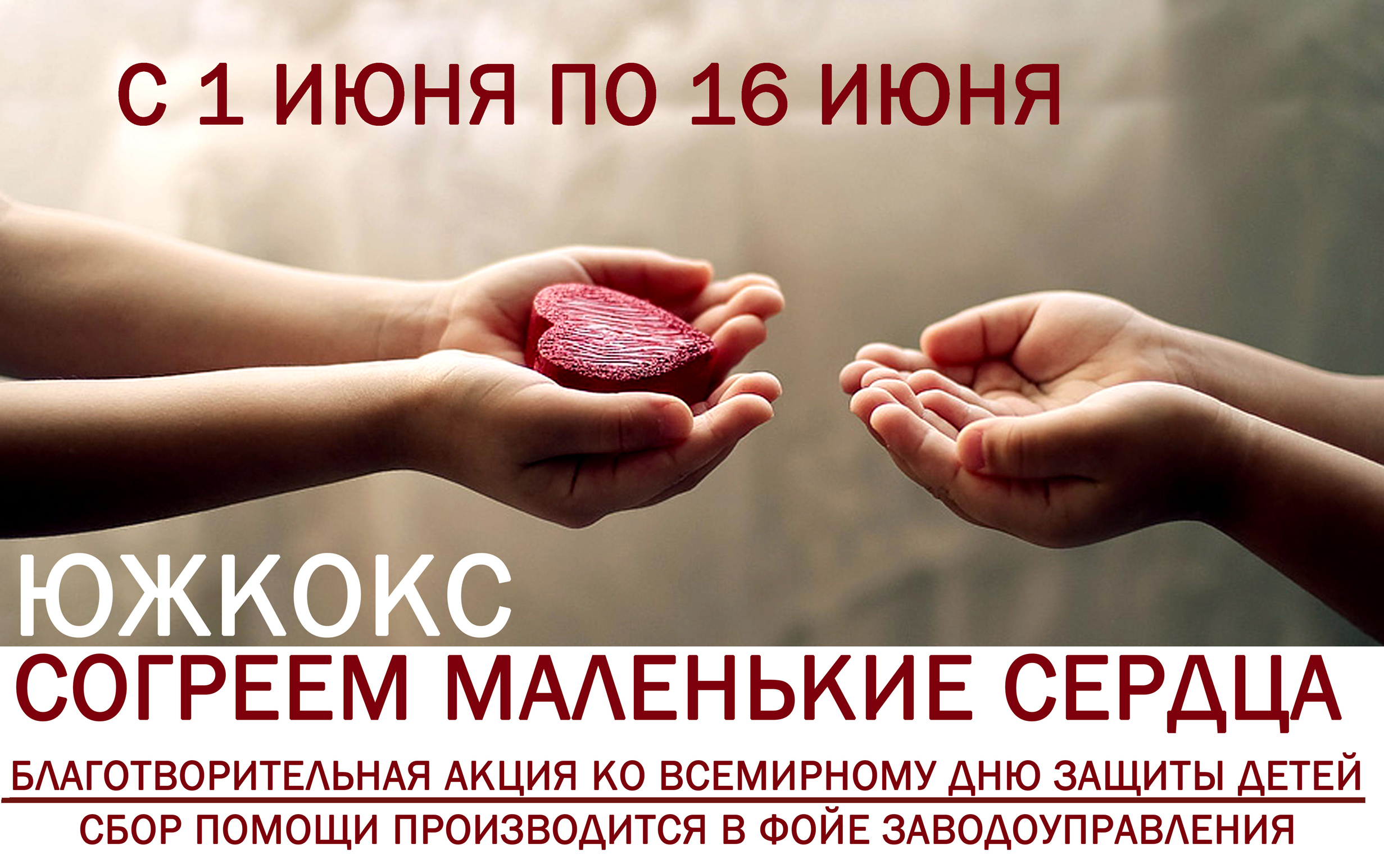 В детских домах Украины на сегодняшний день находится более 71 тысячи детей. Это дети сироты и дети, лишенные родительских прав. По соотношению количества детей находящихся в наших детских домах на количество жителей, этот показатель превышает европейские страны в несколько раз. И причиной есть не только низкий уровень жизни, но и равнодушие нашего общества. Среди этих детей есть не мало детей инвалидов. Ко всемирному дню защиты детей, совет молодых специалистов ЮЖКОКС запускает благотворительную акцию “СОГРЕЕМ МАЛЕНЬКИЕ СЕРДЦА” направленную на поддержку детей находящихся под опекой государства!